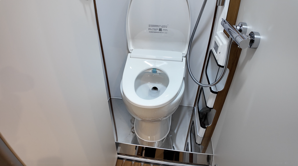 卫浴间部分,房车专用独立式淋浴间设计,配备进口美国 maxxfan 正反转换气扇、房车专用电搅碎马桶及智能马桶盖,如厕时温暖的马桶盖感觉更舒适,还有清洗功能满足个性化需求。一体式淋浴花洒组合,洗澡更便捷。想要清洗衣物,还有韩国进口 mini可以使用。