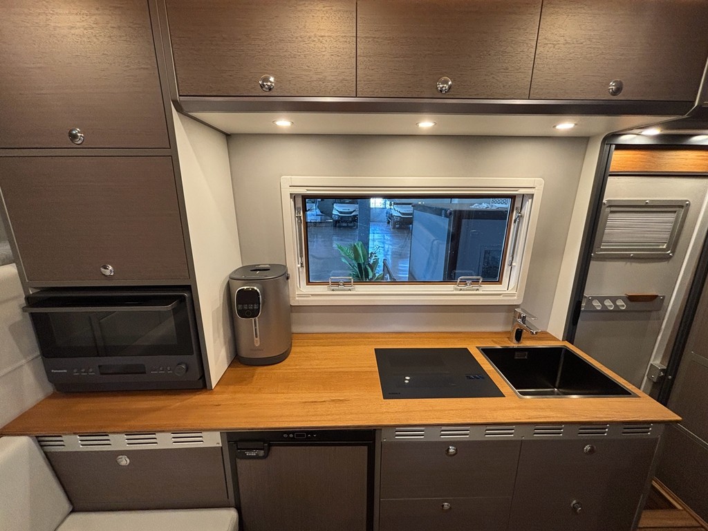 厨房部分,日本松下进口微波蒸烤箱一体机、小米智能持续加热电磁炉、房车专用英德尔冰箱 76l、多功能一体式橱柜,现代化的厨房生活即刻打开!户外还配备了房车专用户外移动厨房,带有柴油猛火炉灶,十人左右的户外露营野餐也能轻轻松松实现。